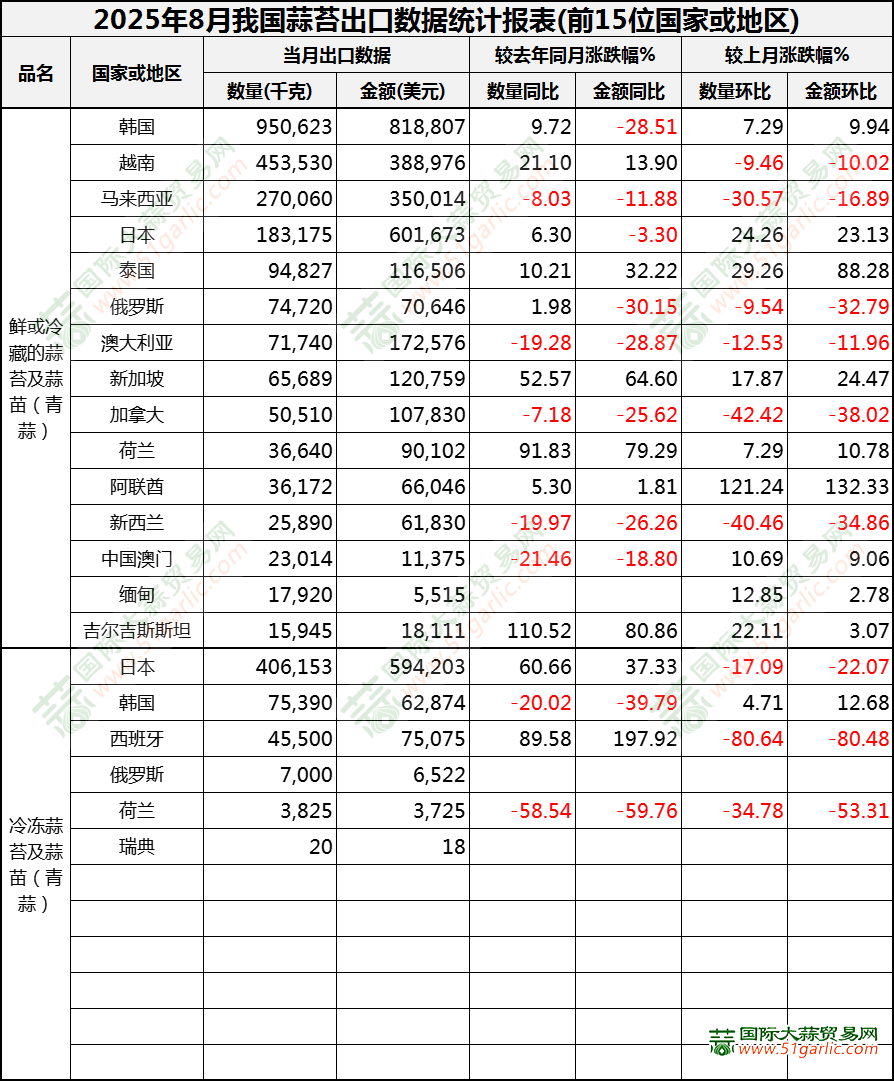 2025年8月蒜苔出口數(shù)據(jù)(按國家)