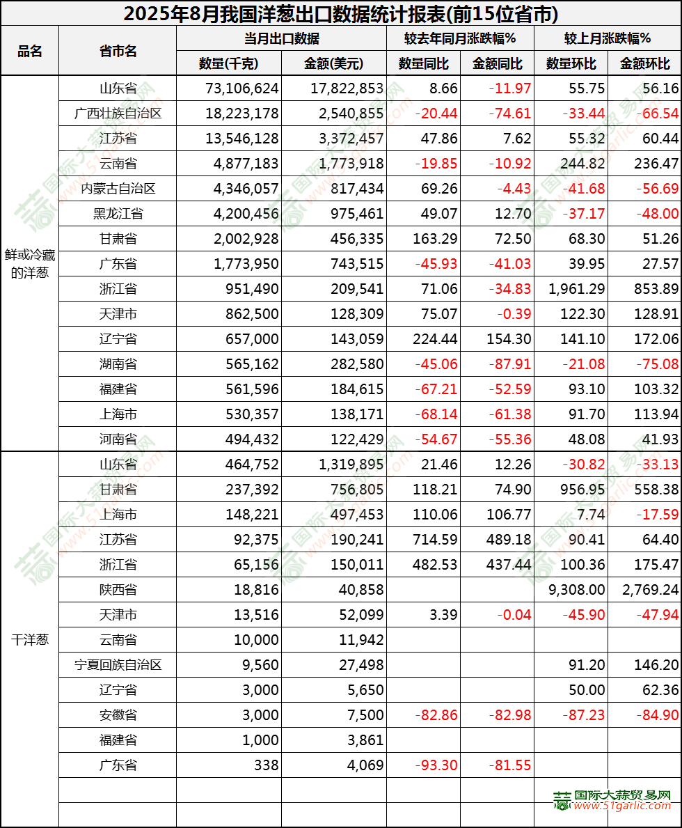 2025年8月洋蔥出口數(shù)據(jù)(按省市)