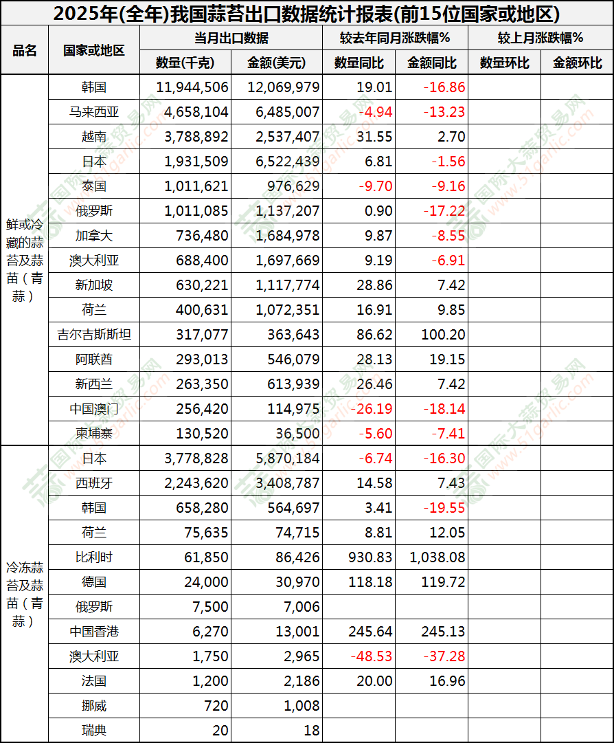2025年全年蒜苔出口數(shù)據(jù)(按國家)