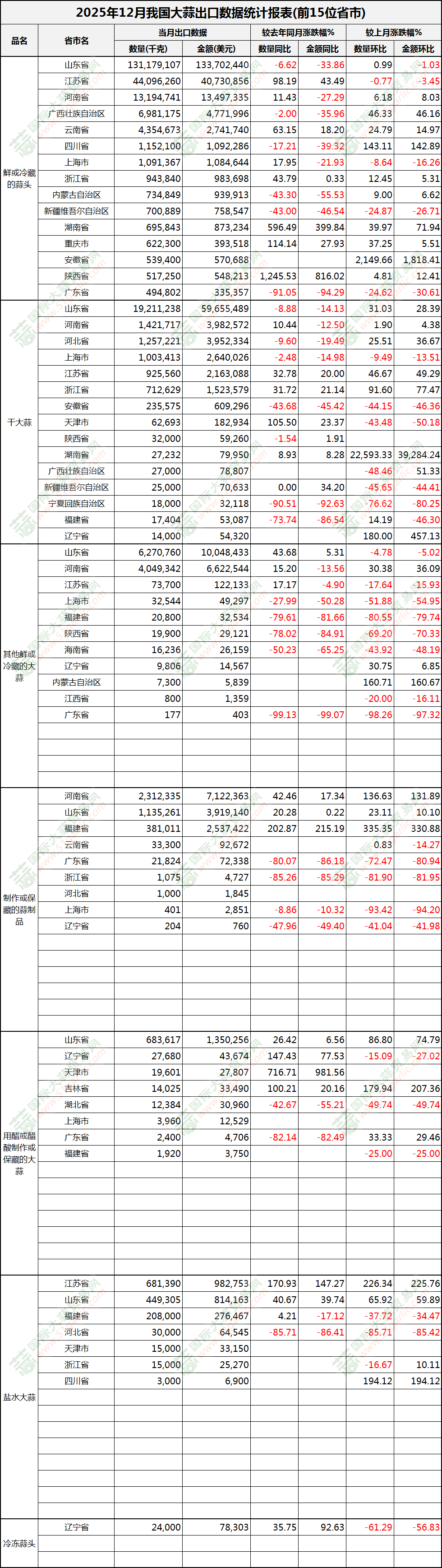 2025年12月大蒜出口數(shù)據(jù)(按省市)