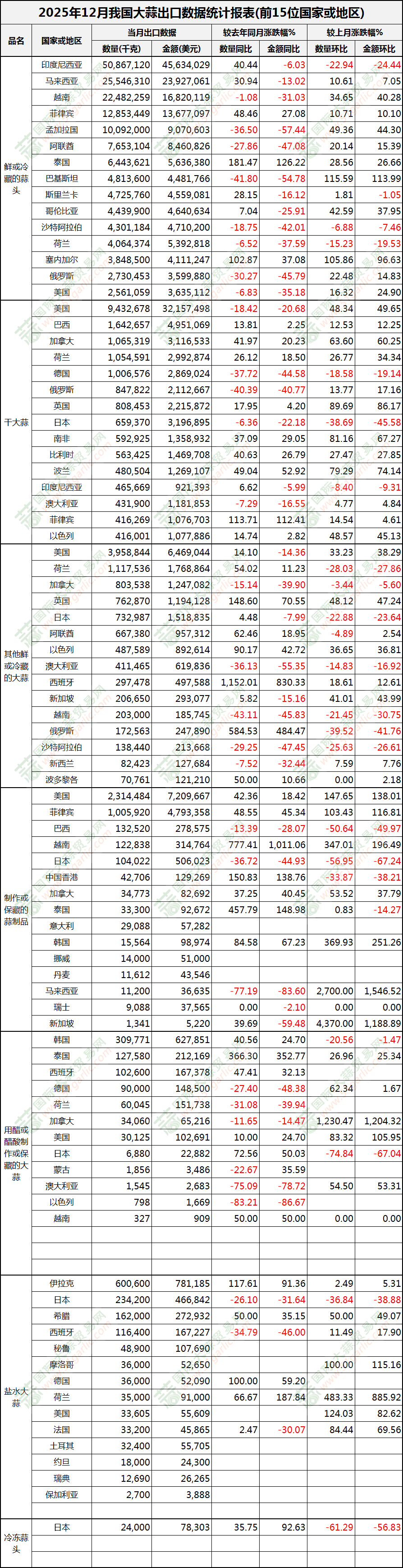 2025年12月大蒜出口數(shù)據(jù)(按國家)