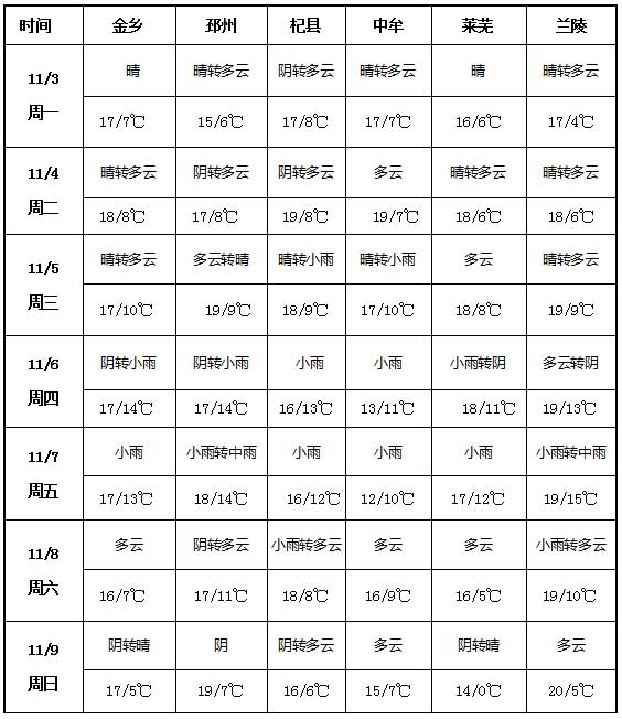 本周(11 月 3 日 - 11 月 9 日),多地天氣和氣溫出現(xiàn)顯著變化。前期天氣以晴好且多云為主,自 11 月 5 日起,金鄉(xiāng)、邳州、杞縣、中牟、萊蕪、蘭陵等地相繼迎來小雨天氣,到 11 月 8 日、9 日又逐步轉(zhuǎn)變?yōu)槎嘣频忍鞖?。周?nèi)產(chǎn)區(qū)氣溫整體波動(dòng)幅度較大。以各地最高氣溫為例,11 月 3 日大多處于 16 - 17℃,11 月 4 日有所升高,部分地區(qū)達(dá)到 18 - 19℃??傮w而言,本周氣溫呈現(xiàn)先升后降的態(tài)勢(shì)。