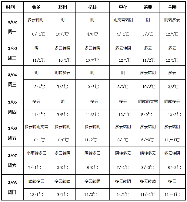 本周(3月2日- 8日)大蒜主產(chǎn)區(qū)(金鄉(xiāng)、邳州、杞縣、中牟、萊蕪、蘭陵)氣溫整體偏低且波動(dòng)明顯。3月2-4日各地最低溫多在 - 1~4℃,最高溫 8~12℃;3月5-7日氣溫顯著回落,多地最低溫降至 - 3~0℃,萊蕪、蘭陵最低溫達(dá) - 3℃、-2℃,最高溫也下滑至 6~11℃;3月8日氣溫逐步回升,杞縣、中牟最高溫回升至 14℃,其余產(chǎn)區(qū)也回暖至 11~12℃。周內(nèi)降水整體偏少,以陰天、多云天氣為主,僅局部出現(xiàn)雨雪:3月2日中牟雨夾雪轉(zhuǎn)陰天,3月5 日萊蕪陰轉(zhuǎn)雨夾雪,3月6日金鄉(xiāng)多云轉(zhuǎn)雨夾雪,3 月7日金鄉(xiāng)小雨轉(zhuǎn)多云。
