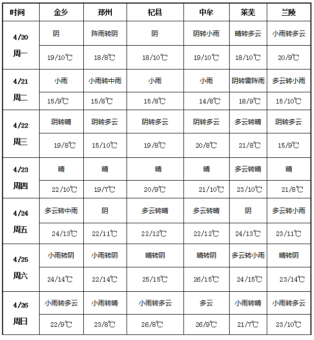 本周(4月20日-26 日),金鄉(xiāng)、邳州、杞縣、中牟、萊蕪、蘭陵等大蒜主產(chǎn)區(qū)以陰雨天氣為主,晴好天氣較少。20日-21日多為小雨或陣雨天氣;22 日起多數(shù)產(chǎn)區(qū)由陰轉(zhuǎn)晴或多云轉(zhuǎn)晴,23日更是大范圍晴好天氣;24日-26 日,產(chǎn)區(qū)再次迎來降水過程。與上周相比,本周大蒜主產(chǎn)區(qū)氣溫大幅下降,晝夜溫差加大,周內(nèi)金鄉(xiāng)產(chǎn)區(qū)最低氣溫為8℃,最高氣溫為24℃。